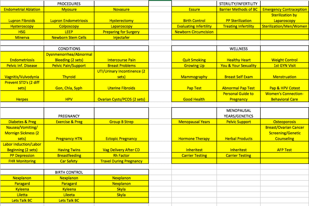 Today I created an Instagram post on postpartum complications at the request of Dr. Leach. He sent me an article from ACOG addressing these complications to which I organized into an aesthetic post. I really enjoy putting information about women’s health together because I am able to learn a lot myself about it along the way and it helps to share that information with others. After the previous week deciding the size and height of the organizational shelves for the closet, I created an excel sheet organizing the pamphlets by category so that employees may find what they are looking for more easily. Since the organizer has not come in yet, I went ahead and organized the pamphlets as they were in the closet because they were kind of a mess at the time. I was hoping to create some sort of interim organization for the employees. Doing small tasks like these highlights the importance of efficiency within a practice and how someone has to be paying attention to small details to make sure the office is working at maximum capacity and efficiency.